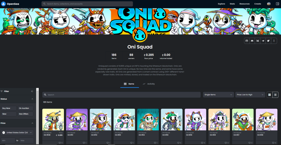 오픈씨에 등록된 Oni Squad는 186개 (88명 오너)가 등록되어 있고 판매하는 것은 단 1개 0.285이더(약 107만원)입니다.