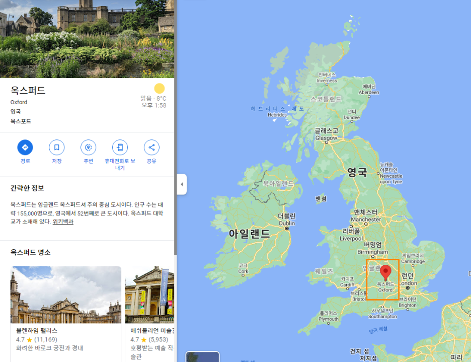 영국 옥스퍼드는 런던의 서쪽에 위치해 있습니다.