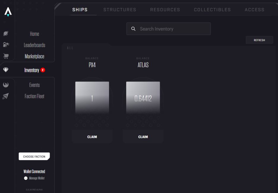 인벤토리 SHIPS 항목에 클레임 가능한 PX4와 ATLAS 가 생겨났습니다.
