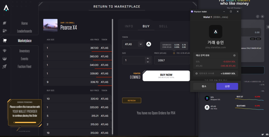 매도가 339.70 ATLAS + FEE 0.78 ATLAS + SOL 수수료 0.0254 SOL 이 소요가 됩니다.