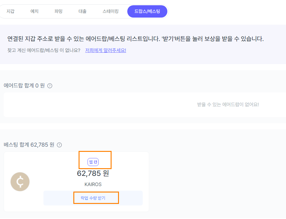 지갑, 예치, 파밍, 대출, 스테이킹, 드랍스/베스팅으로 구분되어 있습니다.