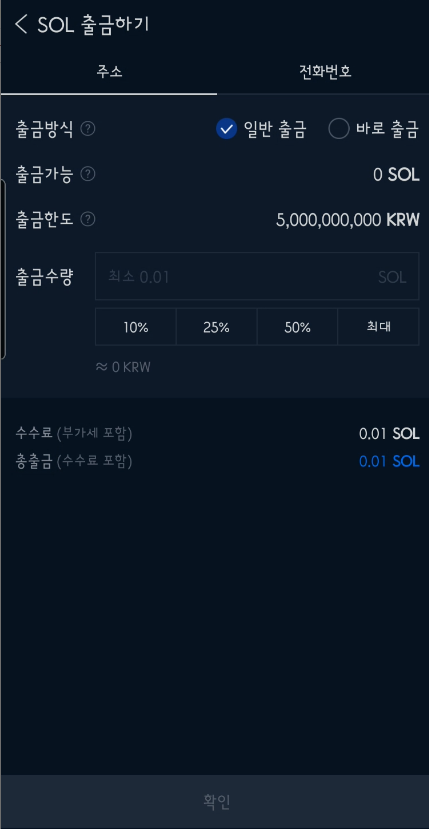 업비트 입출금에서 솔라나를 출금하기 하시면 수수료 0.01 SOL로 팬텀지갑에 옮길 수 있습니다.