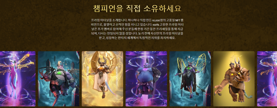 프라임 이터널 챔피언은 매시나 세계의 전사로서, 이더리움 블록체인에서 각각 하나씩만 생성되는 10,000개의 NFT(대체 불가 토큰)입니다.