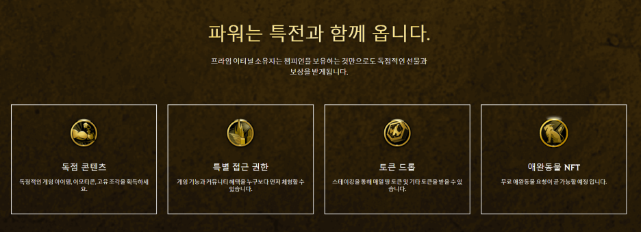 저희는 10,000개의 프라임 이터널 챔피언을 소유하신 분들께 장기적인 혜택을 제공해 드리려 합니다. 특전으로는 독점 콘텐츠, 특별 액세스 권한, 토큰 드롭. 등이 있습니다. 각각의 특전에 관한 자세한 설명을 공식 미디움 페이지. 에서 확인하실 수 있습니다. 프라임 이터널 NFT를 두 개 이상 보유하신 분은 보유 중인 프라임 이터널 챔피언의 개수에 비례하여 혜택을 받을 수 있습니다.