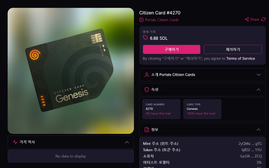 작은 사이즈의 크기로 오픈된 시티즌 카드는 6.88 SOL로 적절한 시기에 가격변동을 살펴보고 진입해 볼 수 있는 기회가 있을 수 있을 것 같네요.