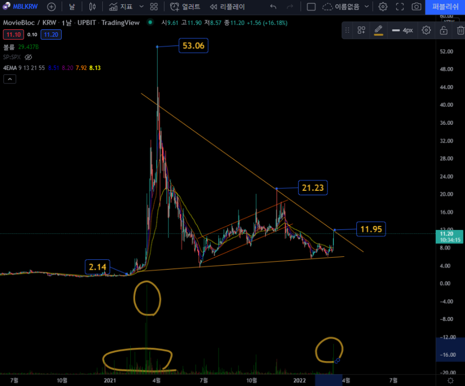 무비블록이 상승하고 있는데 삼각수렴 저항 추정라인을 뚫고 올라갈 수 있을 지 주목하고 있습니다.