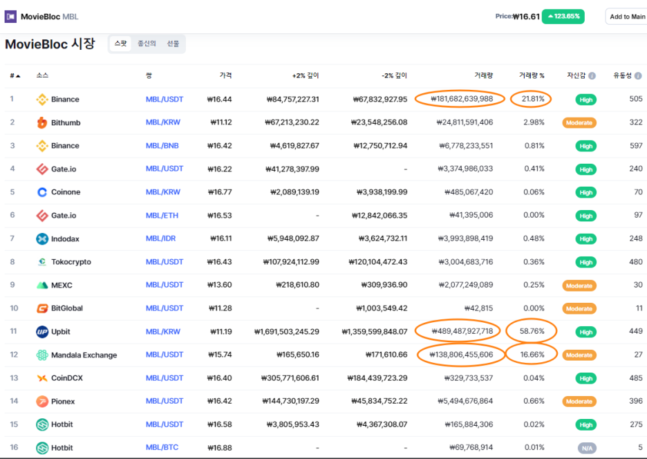 주요거래는 업비트가 절반이상이고 바이낸스와 만달라 익스체인에서 38%정도로 거의 대부분을 차지하고 있습니다.