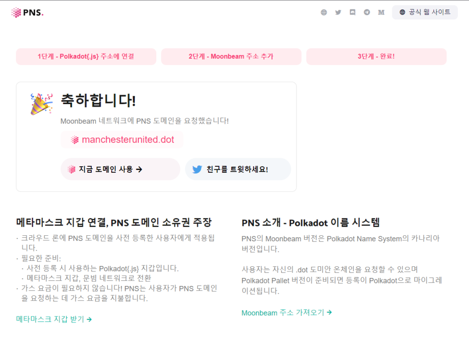 메타마스크 문빔 네트워트 연결을 완료하소 폴카닷 지갑으로 인증을 완료하여 도메일 클레임 신청이 완료 되었습니다.