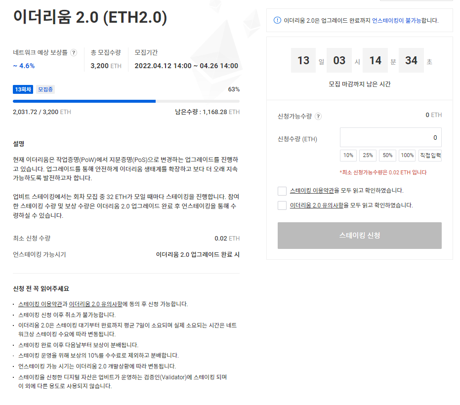 스테이킹 이용약관과 이더리움 2.0 유의사항에 동의 후 신청 가능합니다.