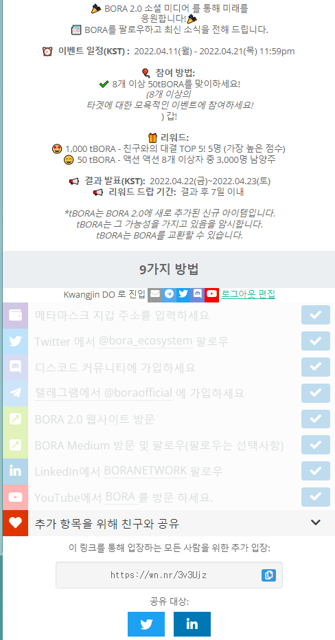 😄 50 tBORA - 소셜 액션 8개 이상 완료자 중 3,000명 추첨