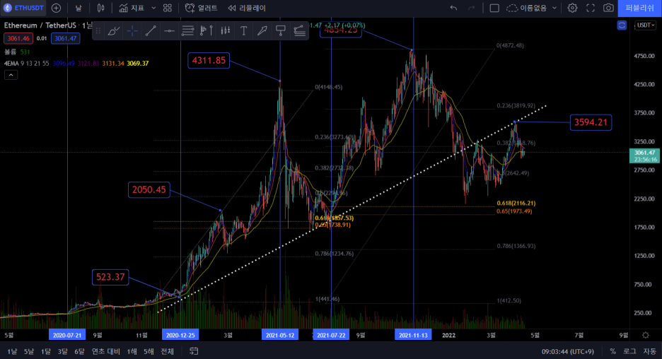 Trading View 3월 9일자 전망 올린 내용을 보니 채널 이탈 후 50%정도 상승을 그어 났는데 떨어진 부분의 38%정도 반등이 나오고 다시 조정받는 상황입니다.