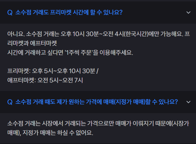 소수점 거래는 오후 10시 30분~ 오전 4시(한국시간)에만 가능