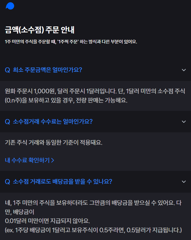 금액주문인 (소수점 미만) 경우에 원화주문 천원, 달러 주문 1달러가 최소 주문금액