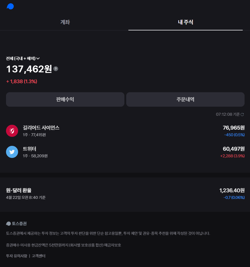 구매 절차를 익힐 겸 하루에 1주씩 길리어드 사이언스 1주와와 트위터를 1주씩 매수해 봤습니다.