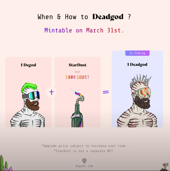 Degod + StarDust (1000 $DUST) = 1 Deadgod 가 된다고 합니다.