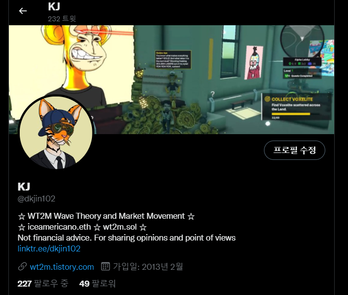 KJ @ dkjin102 ☆ WT2M Wave Theory and Market Movement ☆ ☆ iceamericano.eth ☆ wt2m.sol ☆ Not financial advice. For sharing opinions and point of views http:// linktr.ee/dkjin102 wt2m.tistory.com