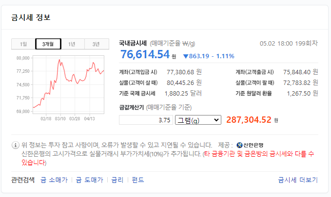 국내금시세로는 이전보다 소폭 상승해 있는 모습입니다.