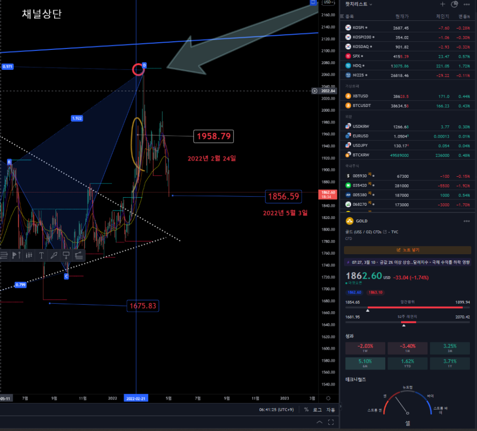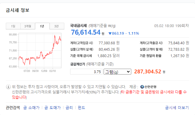 온스당 가격 기준으로 2월 24일 기준 1950불 부근이였다면 5월 3일 기준 1,860불대 입니다.