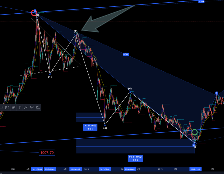 2011년 9월 탑 상승 이후 대략적인 하락의 각도와 기간은 아래의 모습이겠고