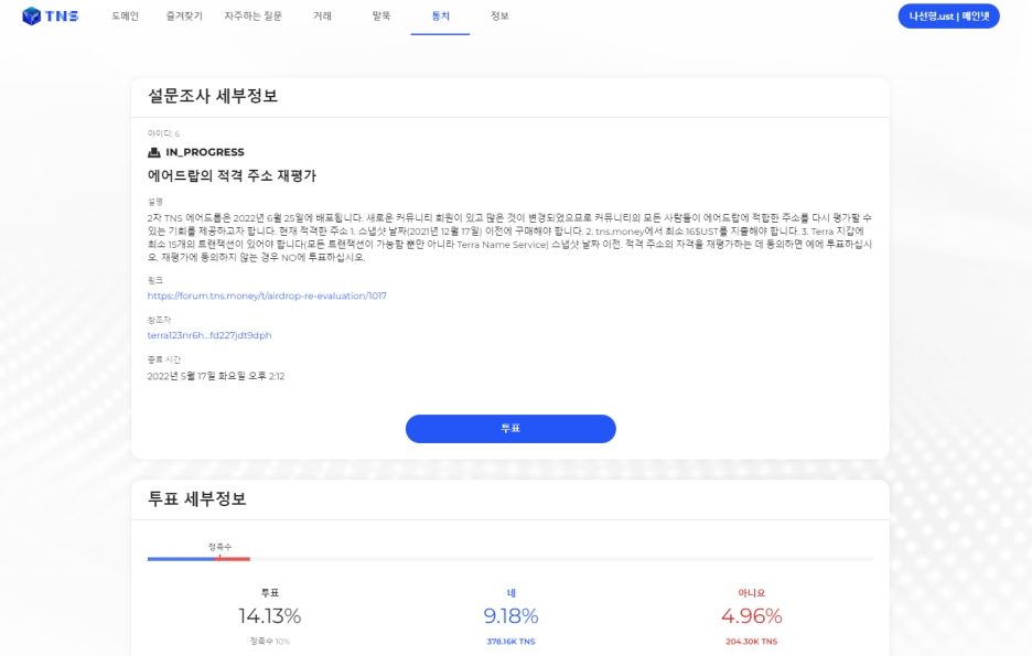 3. Terra 지갑에 최소 15개의 트랜잭션이 있어야 합니다(모든 트랜잭션이 가능함 뿐만 아니라 Terra Name Service) 스냅샷 날짜 이전. 적격 주소의 자격을 재평가하는 데 동의하면 예에 투표하십시오.