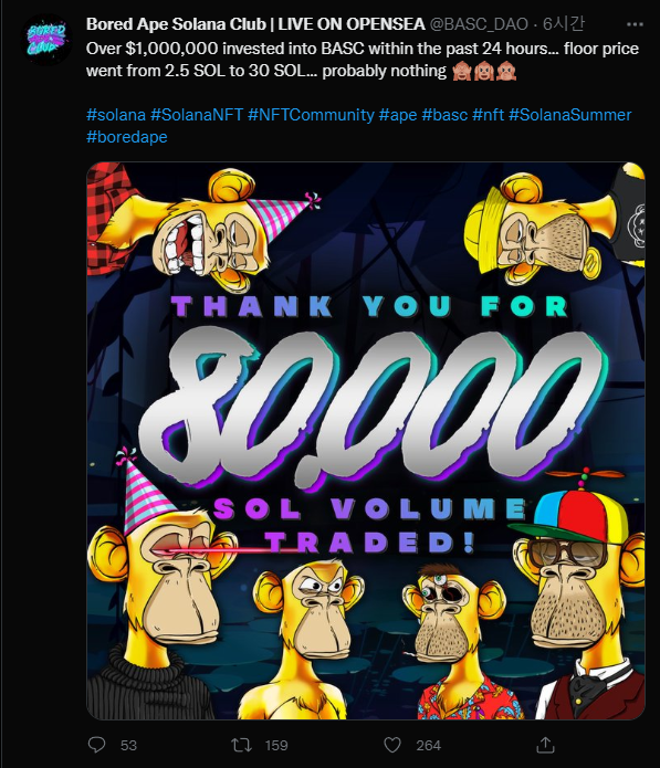 몇일 전 까지 2~4솔 머무르던 BASC, BoredApeSolnanaClub에 부스팅이 시작됐습니다.
