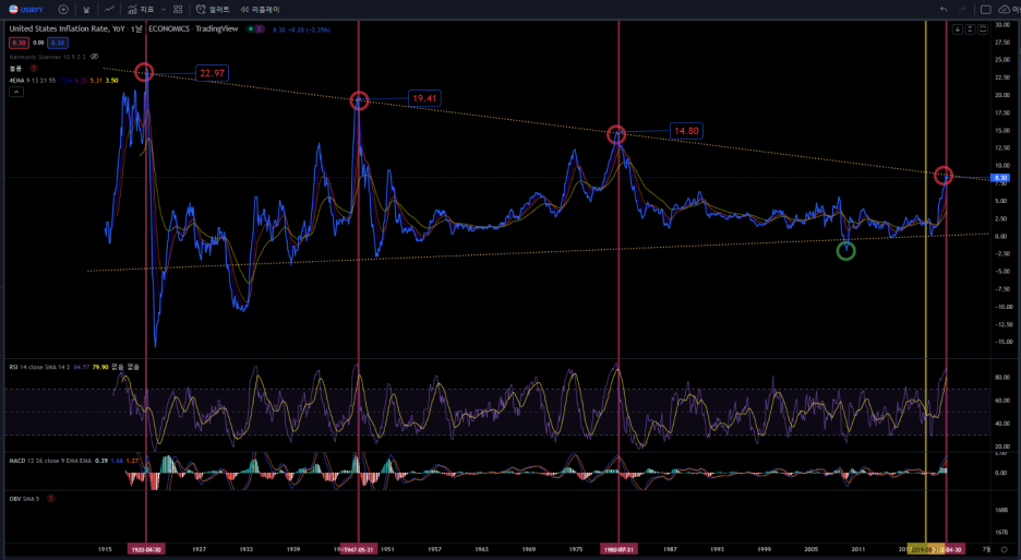 1980년 이래로 잘 관리해오던 미국의 인플레이션레잇이 8.3% 상단라인까지 치솟아서 역사적인 상단라인을 뚫을 수 있는 가능성도 보이고 있습니다.