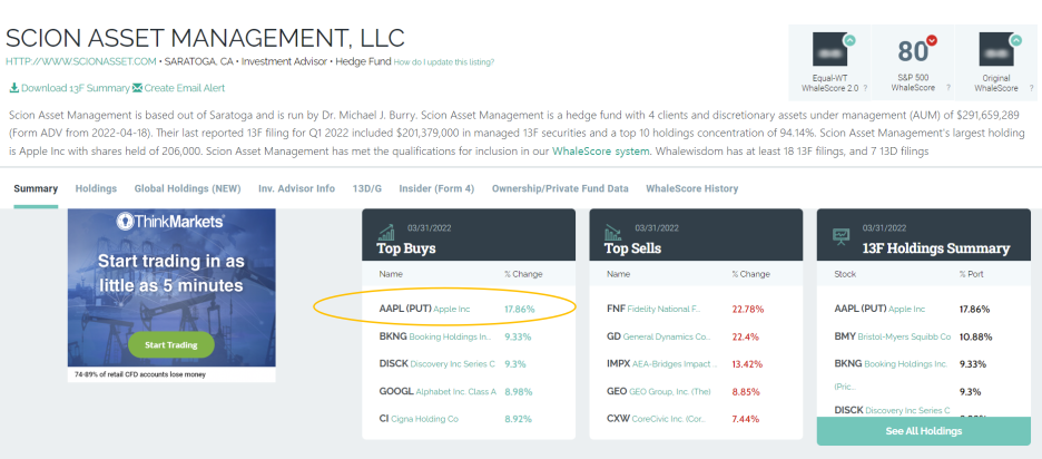 빅쇼트 마이클 버리님의 Scion Asset에서 애플(AAPL)에 풋옵션(하락베팅) 을 걸었네요.