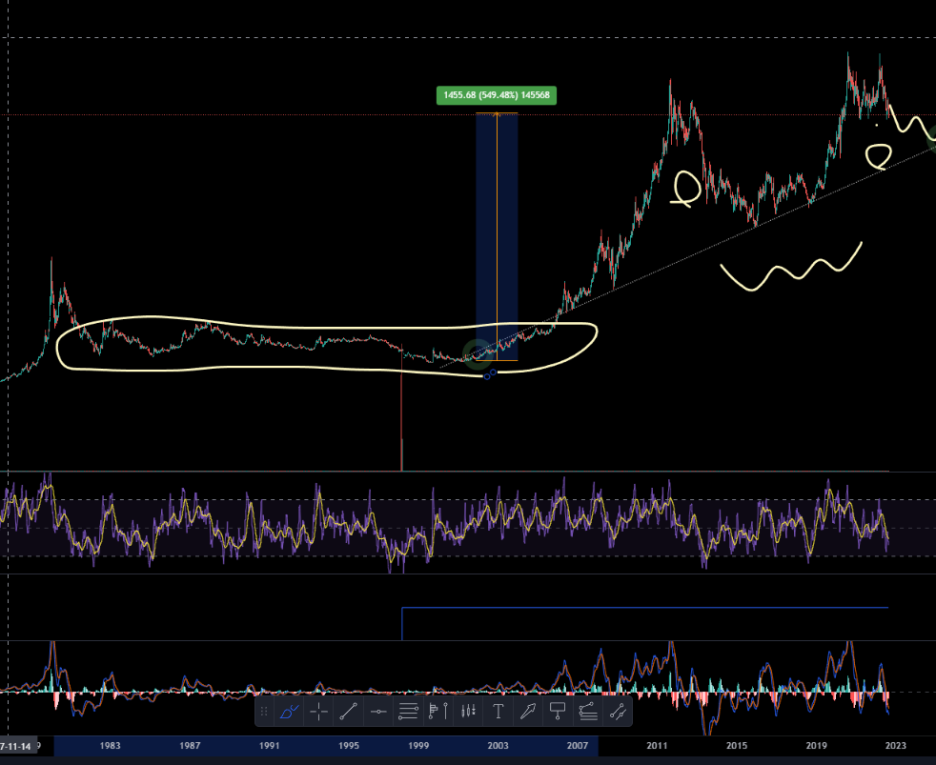 2000년 초반까지 금 가격은 200~400불을 오가며 박스피와 같은 모습이였고 2006년 이후 본격적인 상승이 일어났습니다.