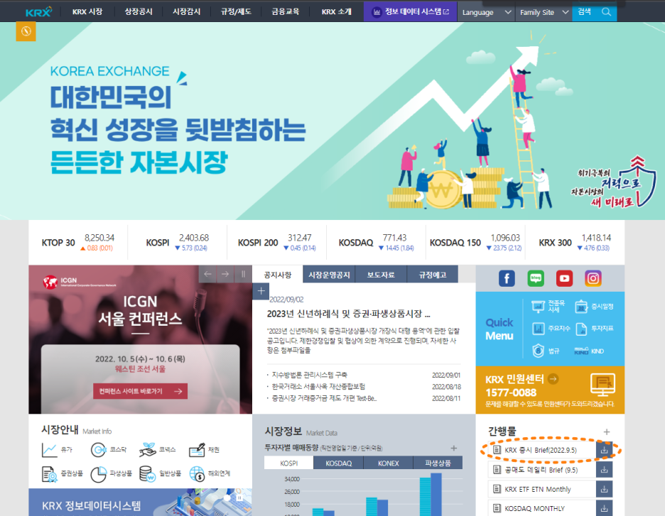 KTOP 30 8,250.34 ▲ 0.83 (0.01) KOSPI 2,403.68 ▼ 5.73 (0.24) KOSPI 200 312.47 ▼ 0.45 (0.14) KOSDAQ 771.43 ▼ 14.45 (1.84) KOSDAQ 150 1,096.03 ▼ 23.75 (2.12) KRX 300 1,418.14 ▼ 4.76 (0.33) 이전 다음 재생/정지 시장안내 Market Info 유가 코스닥 코넥스 채권 증권상품 파생상품 일반상품 해외연계