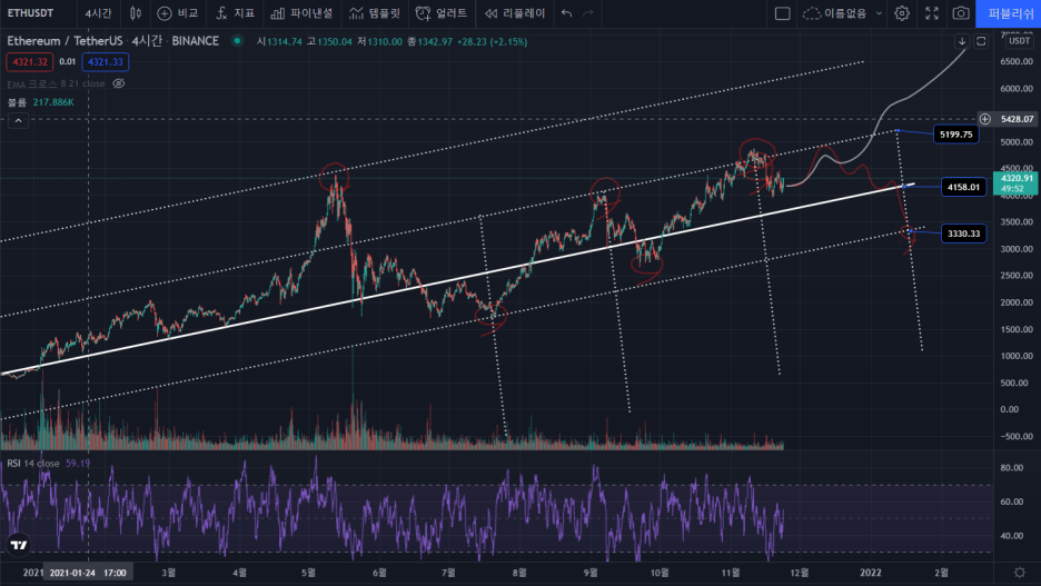 올해 이더리움은 계속적으로 우상향이 나와줬고 5월 12일 피크 부근에 구매만 아니라고 한다면 대부분 수익권일 가능성이 높습니다. 비트코인이 연말까지 상승해준다면 이더리움도 상단 채널을 뛰어넘어 올라 갈 가능성이 높아 보입니다. 만일 채널 하단까지 내리고 패닉셀의 폭락 기조만 아니라면 채널 하단까지 가격이 내려오면 매수의 기회가 될 수 있겠습니다.