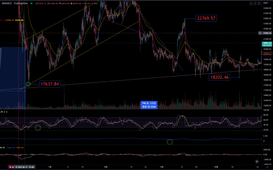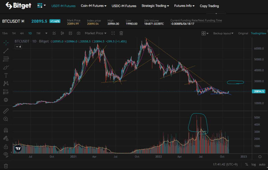 22년 6월 3만불 때 강한 매도 볼륨에 싸대기 맞고 17,600까지 내려왔는데