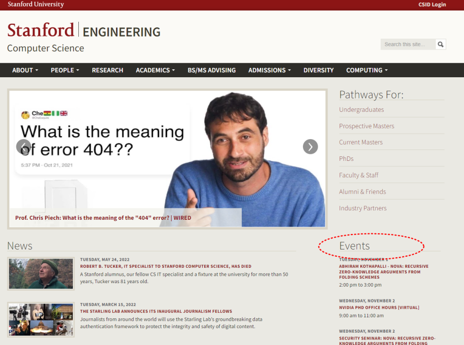 Prof. Chris Piech: What is the meaning of the "404" error? | WIRED ‹ › Pathways For: Undergraduates Prospective Masters Current Masters PhDs Faculty & Staff Alumni & Friends Industry Partners News Tuesday, May 24, 2022 Robert B. Tucker, IT specialist to Stanford Computer Science, has died A Stanford...