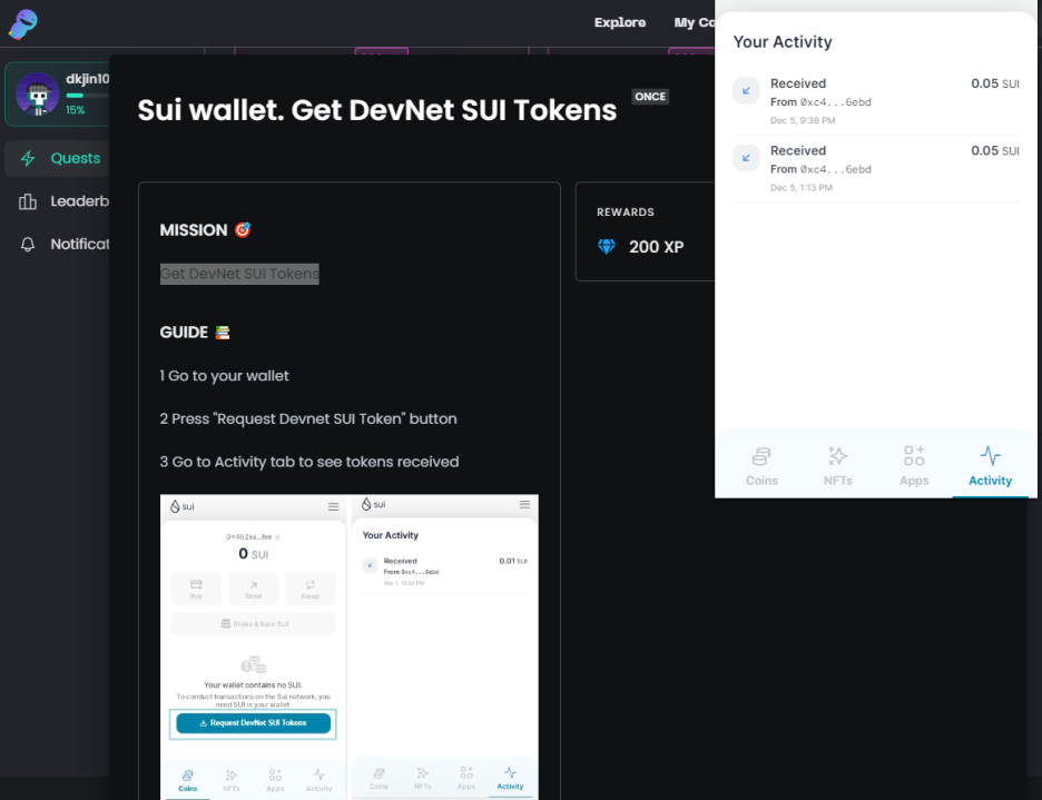 Sui Devnet SUI Tokens을 요청하면 데브넷 코인이 들어와서 이것 저것 테스트를 진행가능