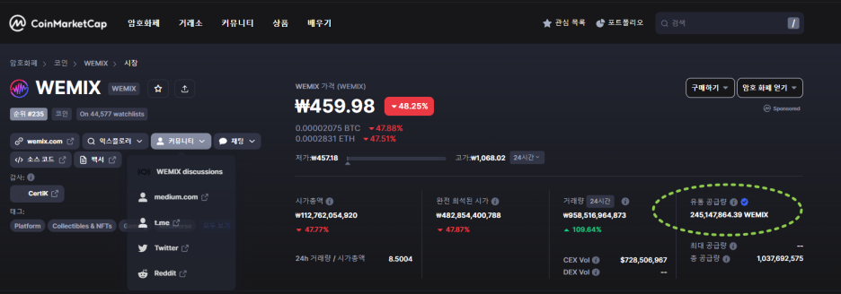 이후 이 부분에 관하여 거래소와의 의견차가 있음을 확인하였고 이를 유통량으로 보아야 한다는 거래소의 의견을 적극 반영하여 2022.10.25. 코인마켓캡 수치를 업데이트하였고 그 결과로 총 318,421,502 위믹스 유통량이 업데이트 되었습니다.