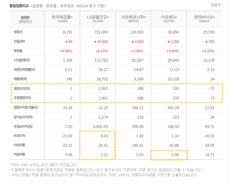 동일업종 중에서는 LG생활건강이 독보적 규모와 성과인데