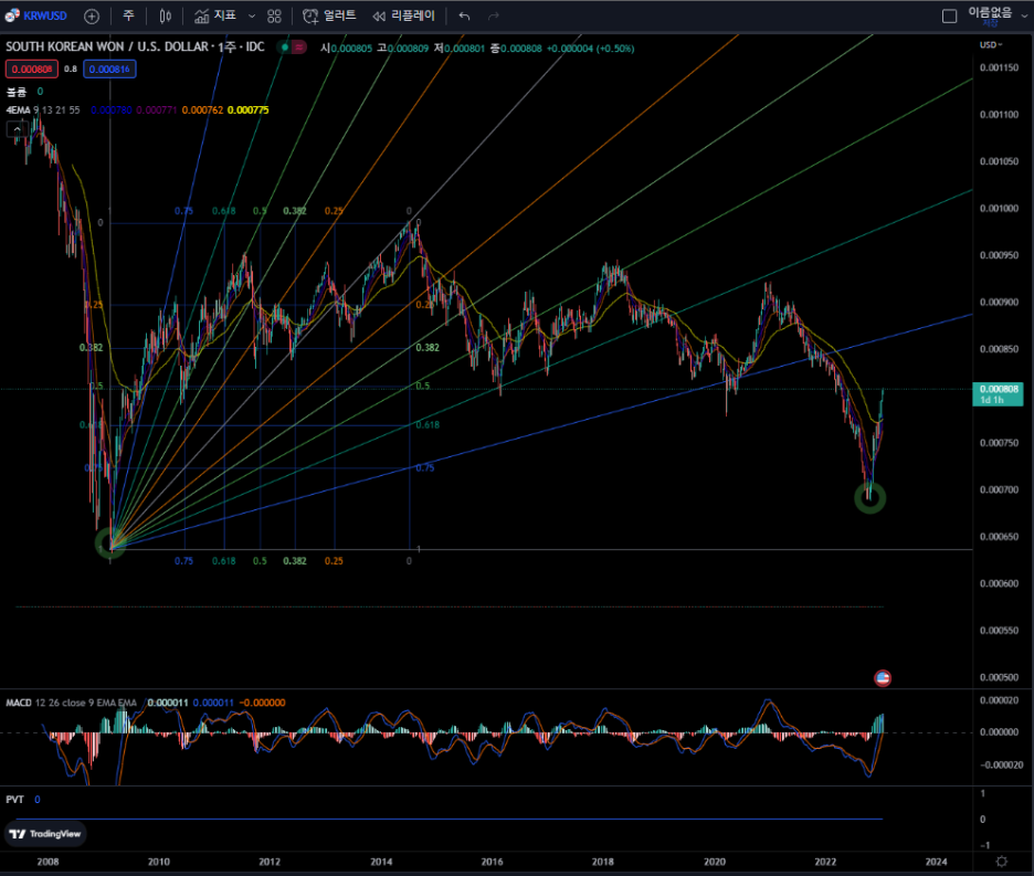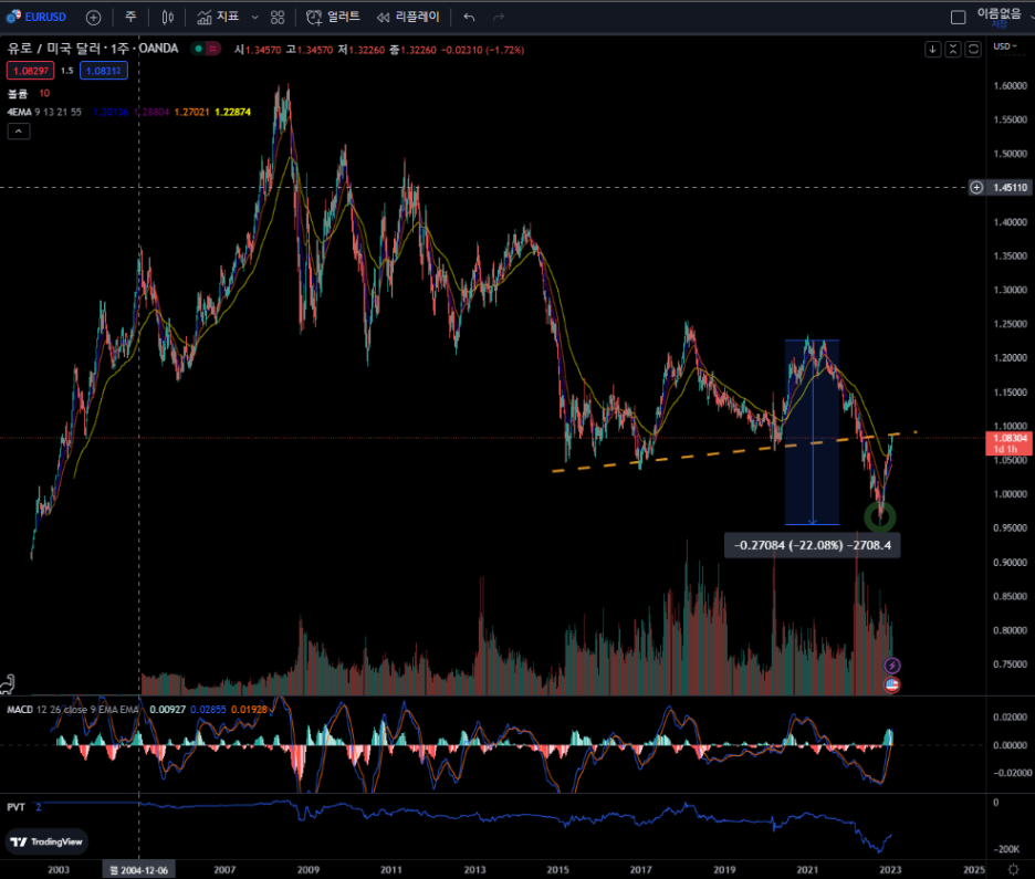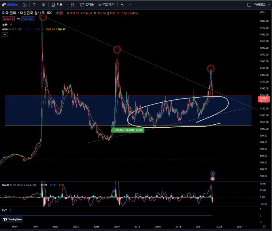 달러의 경우는 짧은 구간에서는(? 연단위이긴 하지만) 탑 찍고 하락 추세에 들어간 상황으로 보임