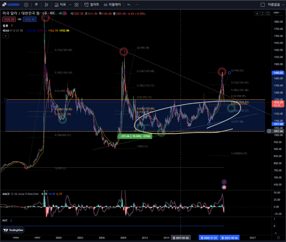 2009년 1,600원 환율 이후에 최대치인 1,450원까지 상승후 급격한 하락 추세