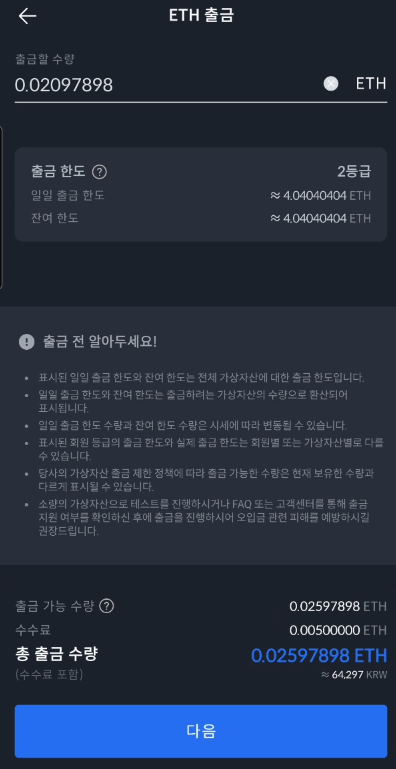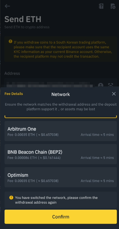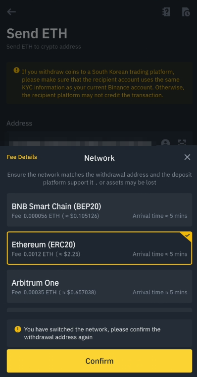 Ethereum (ERC20) = Fee 0.0012 ETH ($2.25) - 3천원이 좀 안되는 금액