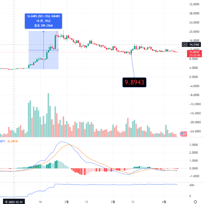 3) 2달 정도 횡보 후 인펄스 상승 시작 $3~$4대에서 $20대 까지 재상승