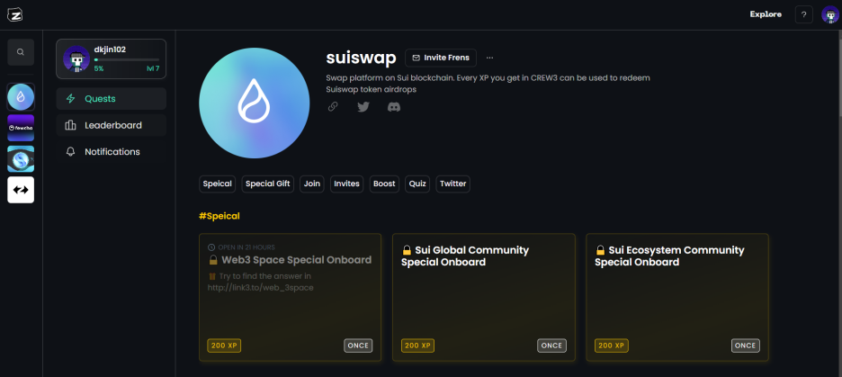 DEX인 수이스왑의 경우 Crew3 진행한 XP만큼 에어드랍 해준다고 하네요.