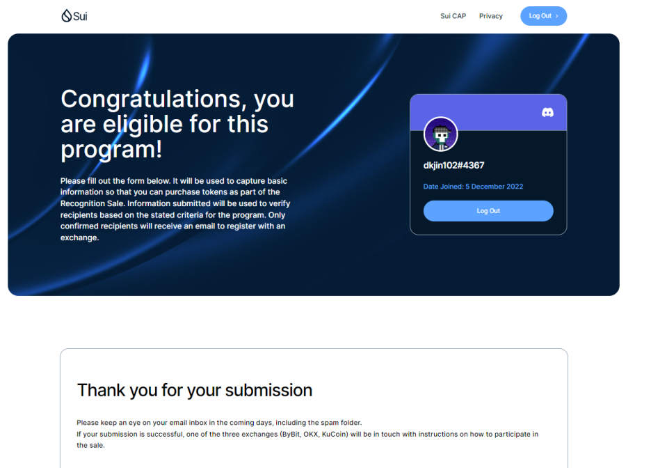 SUI 재단은 조건을 충족한 사용자의 이메일 주소와 이름을 허용 리스트에 제공하며 이는 집계 기간 동안 검증을 위해 사용됩니다.