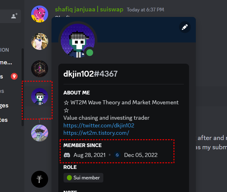 요렇게 Sui 디스코드에서 글을 쓰고 프로필을 클릭해보면 가입일자가 표시됩니다.