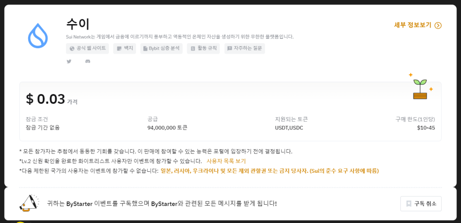 1 . 사용자는 신원 확인 Lv를 완료해야 합니다. 2 이 SUI 토큰 판매("토큰 판매")에 대한 자격이 있습니다. 기관 및 마켓 메이커는 참여할 수 없습니다.