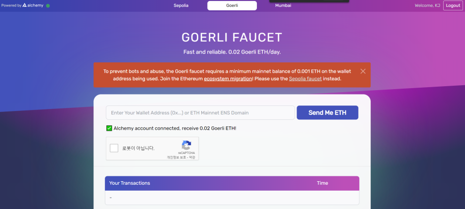 메타마스크 지갑 주소를 기재하고 로봇 아님을 클릭 후 Send Me ETH