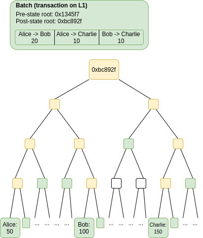 누구나 이전 상태 루트 및 새 상태 루트( 트랜잭션 처리 후 Merkle 루트)와 함께 고도로 압축된 트랜잭션 모음인 배치를 게시 할 수 있습니다 . 계약은 배치의 이전 상태 루트가 현재 상태 루트와 일치하는지 확인합니다. 그렇다면 상태 루트를 새 상태 루트로 전환합니다.