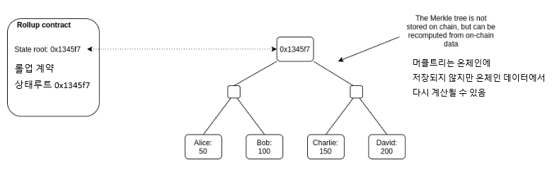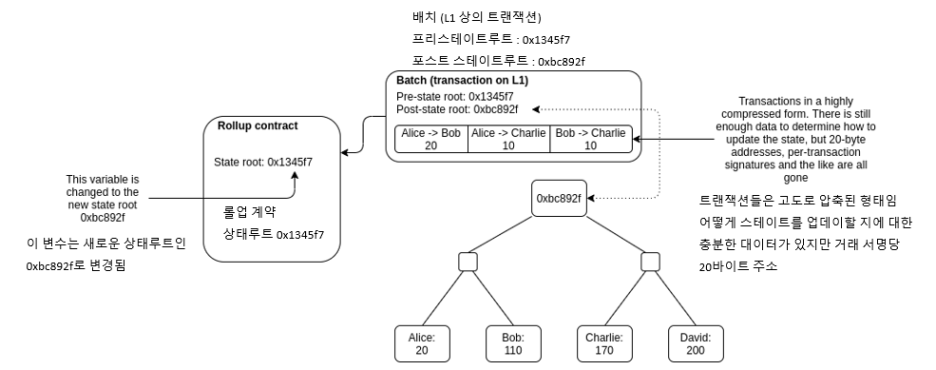 상태 루트를 유지하는 온체인 스마트 계약이 있습니다 : 롤업 상태의 Merkle 루트(즉, 롤업 "내부"에 있는 계정 잔액, 계약 코드 등).