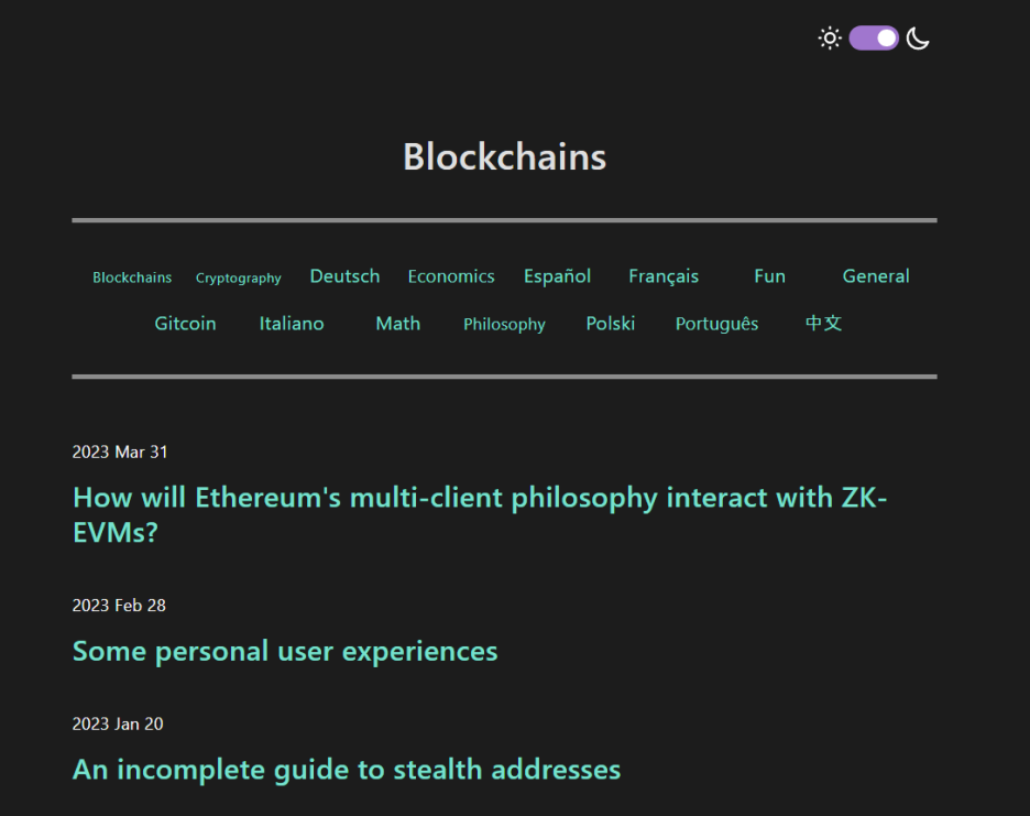 2023 Mar 31 How will Ethereum's multi-client philosophy interact with ZK-EVMs? 2023 Feb 28 Some personal user experiences 2023 Jan 20 An incomplete guide to stealth addresses 2022 Dec 06 Updating my blog: a quick GPT chatbot coding experiment 2022 Dec 05 What in the Ethereum application ecosystem ex...