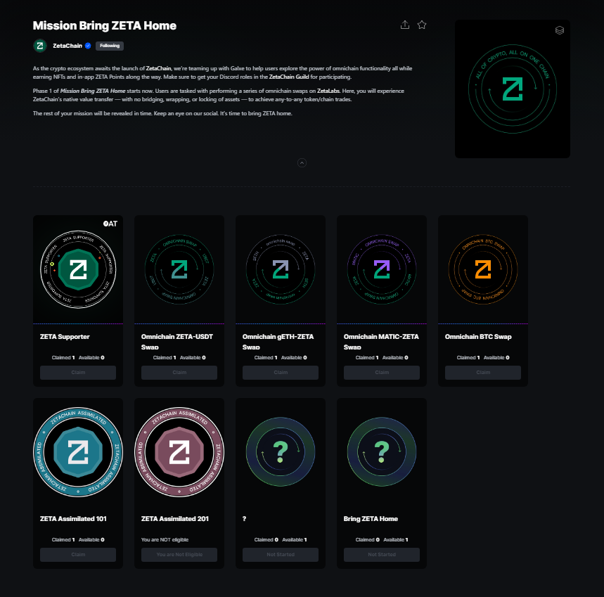 암호화폐 생태계가 ZetaChain 의 출시를 기다리면서 우리는 Galxe와 협력하여 사용자가 옴니체인 기능의 힘을 탐색하는 동시에 NFT와 인앱 ZETA 포인트를 획득할 수 있도록 돕고 있습니다.