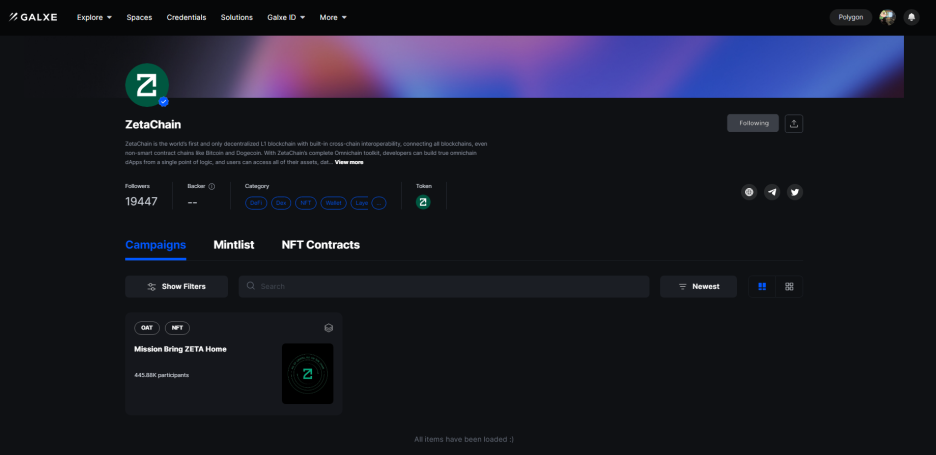 Explore ZetaChain community space on Galxe. Collect NFTs, bounties and on-chain credentials from ZetaChain on Galxe