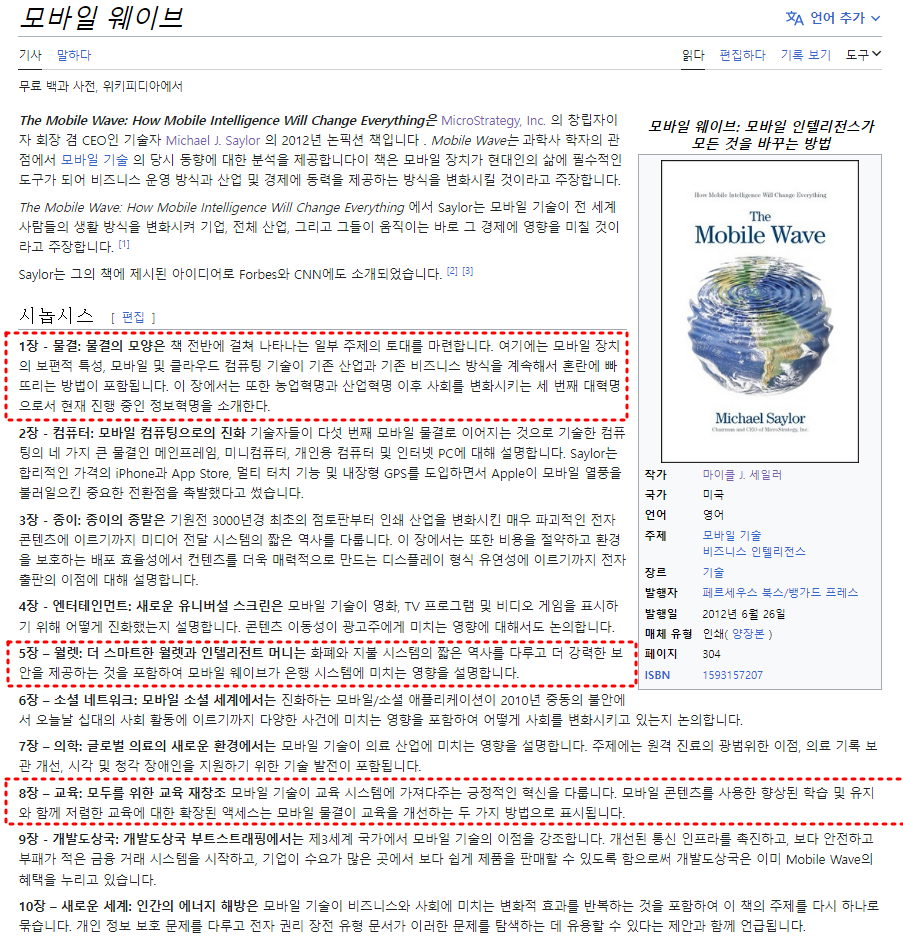 5장 – 월렛: 더 스마트한 월렛과 인텔리전트 머니는 화폐와 지불 시스템의 짧은 역사를 다루고 더 강력한 보안을 제공하는 것을 포함하여 모바일 웨이브가 은행 시스템에 미치는 영향을 설명합니다.